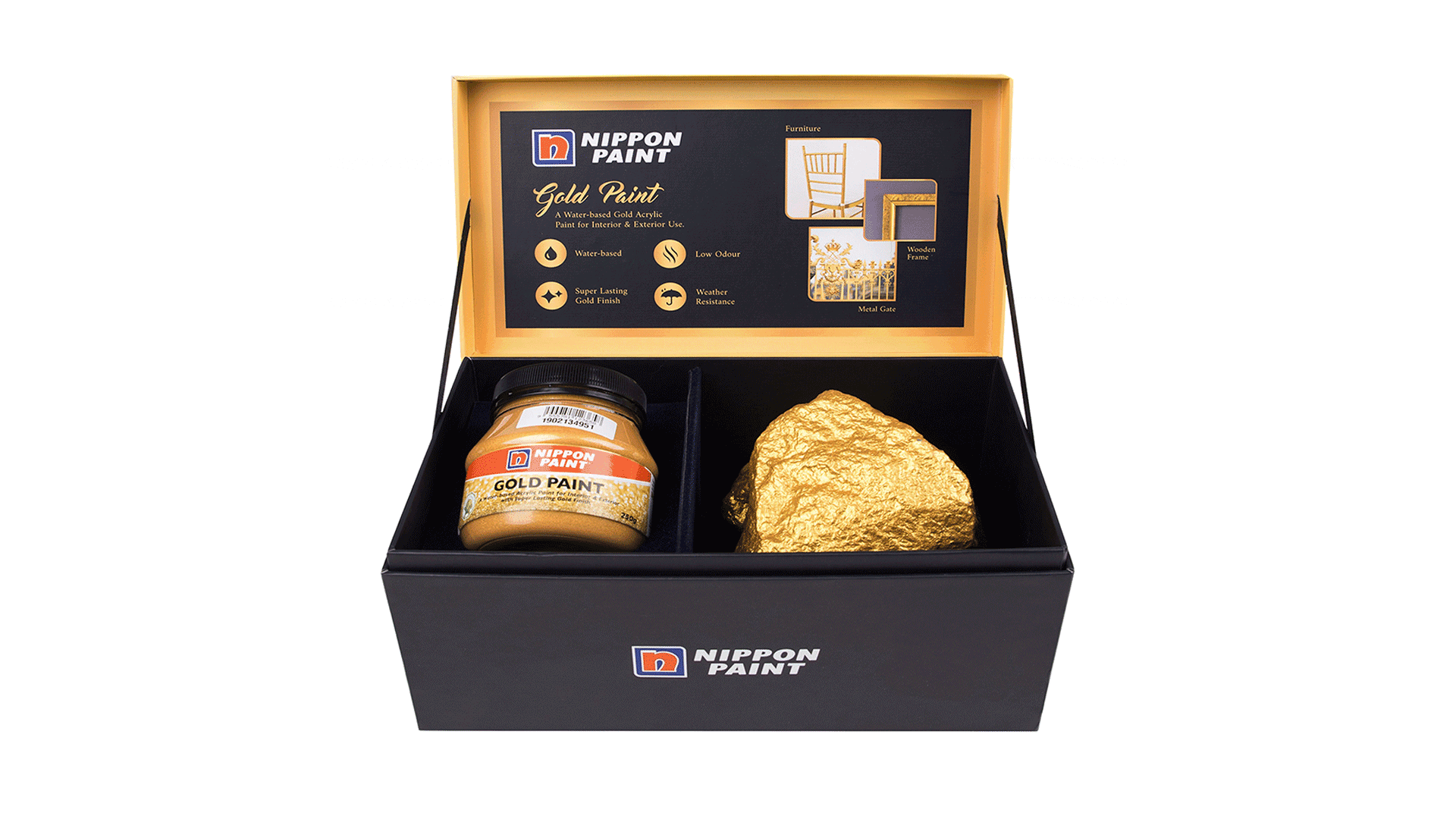 Gold has motivated entire societies, determined the fate of kings and emperors, and inspired the most beautiful works of art. We designed and produced Nippon Paint Gold Paint packaging display boxes for its authorised dealers and resellers. The packaging allows users to experience opening a treasure chest to uncover what’s within. Once opened, the user discovers a bottle of Nippon gold paint and a precious gold rock covered with Nippon Gold Paint. The pairing of gold and dark navy colour creates a contrast that captivates the user, while the pouring of gold paint conveys the paint’s fluidity and expressiveness. In addition, the golden frame around the box captures the ‘golden touch’, akin to a framed piece of art. Product information, usage scenarios, and call to action are depicted inside the packaging to provide users with comprehensive information about the Nippon Gold Paint and inspire them to unleash their creativity with its mesmerising golden hues.